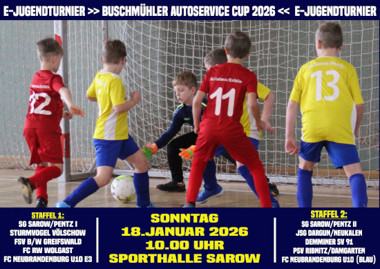 Die E-Jugend der SG Sarow/Pentz bestreitet bei ihrem eigenen Hallenturnier, dem Buschmühler Autoservice – Cup, das Auftaktspiel gegen Sturmvogel Völschow. Insgesamt zehn Teams werden am Sonntag ab 10.00 Uhr um den Turniersieg spielen. Spannung ist vorprogrammiert in der Sarower Sporthalle, die komplett gefüllt sein wird.