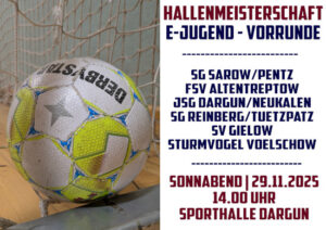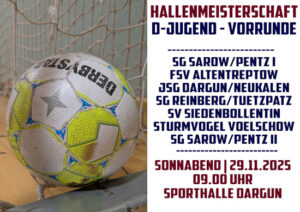 Für unsere E-Jugend und D-Jugend beginnt am Sonnabend die diesjährige Hallenmeisterschaft mit den Vorrunden…… Unsere beiden D-Jugendteams sind dabei in einer Staffel, die in Dargun (09.00 Uhr) gespielt wird.